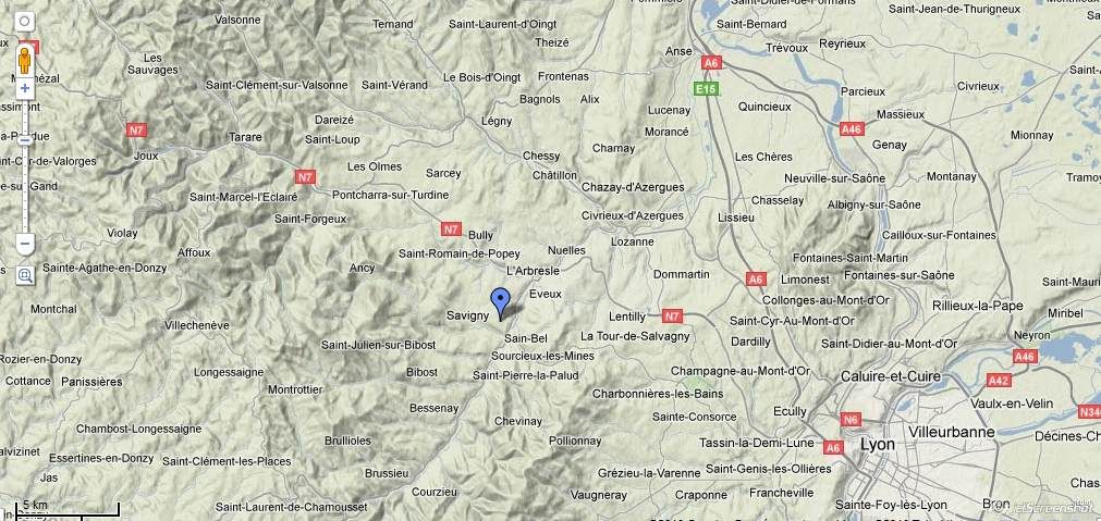 Position de la station entre Lyon et Tarare sur une carte Google Map avec visualisation du relief