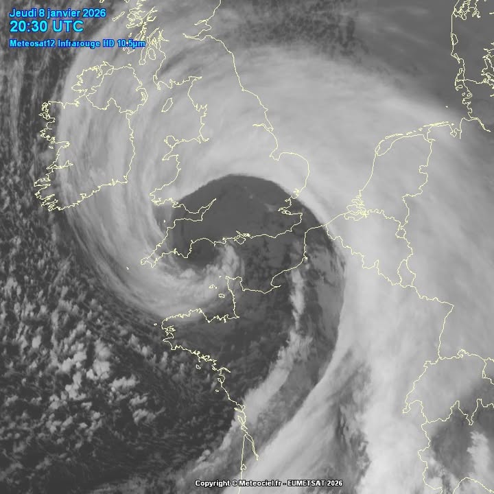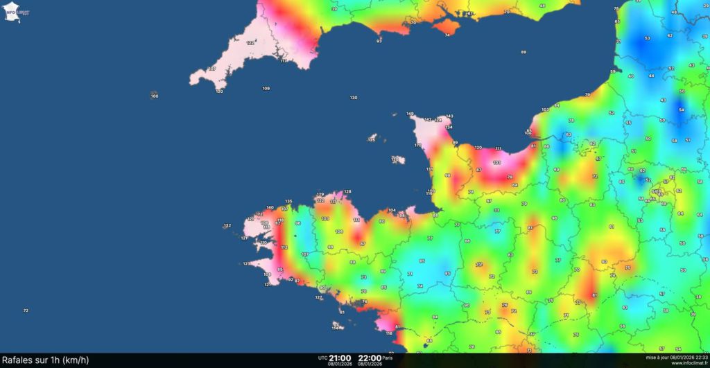 le 9 janvier 2026 à 16h27 La tempête #Goretti est passé, voici la carte des valeurs définitives de vent Réseaux #meteofrance et #infoclimat Cartographie Infoclimat