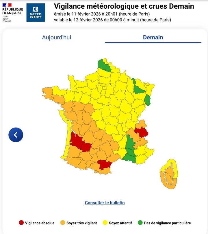 le 11 février 2026 à 21h32 Bilan météo – Mercredi 11 février 2026 (17h45) Semaine fortement agitée – Jour 2 A cette heure : 🔴 4 départements en vigilance rouge 🟠 30 départements en vigilance orange Le contexte météorologique reste explosif : 🌬️ Jet Stream toujours très puissant Jusqu’à 250–300 km/h dans le Golfe de Gascogne Environ 200 km/h à 500 hPa sur le Sud-Ouest 🌊 Tempête NILS en plein creusement Dépression en rapide intensification Pression attendue : 970-975 hPa en Manche Perte d’environ 10 hPa en moins de 24h ⚡ Atmosphère très instable CAPE > 1000 J/kg sur le Sud-Ouest Risque orageux niveau 2 (Estofex) → très rare en février 💨 Vent tempétueux attendu Effet Venturi marqué sur le Sud-Ouest et l’Aude. 📍 Rafales déjà observées : – 187 km/h – Cap Sagro (2B) – 165 km/h – Porto-Vecchio (2A) – 130 km/h – Soumont (34) 🌧️ Pluies soutenues : en 12h – 39 mm – Ballon de Servance (70) – 34 mm au hameau du Tour (74) – 27 mm à Bénéjacq (64) – 23 mm à Briquebec (50) 🔴 Nouvelle évolution à 20h : ➡️ Savoie en vigilance rouge avalanches ⚠️ Situation exceptionnelle avec 3 phénomènes en rouge : Pluie / Vent / Avalanches 👉 Restez prudents et suivez les consignes officielles. Retrouvez le lien vers le bulletin en commentaire sur le site Infoclimat #TempêteNils #VigilanceRouge #Météo #Infoclimat 🌧️💨⚡Photos de la publication de Infoclimat