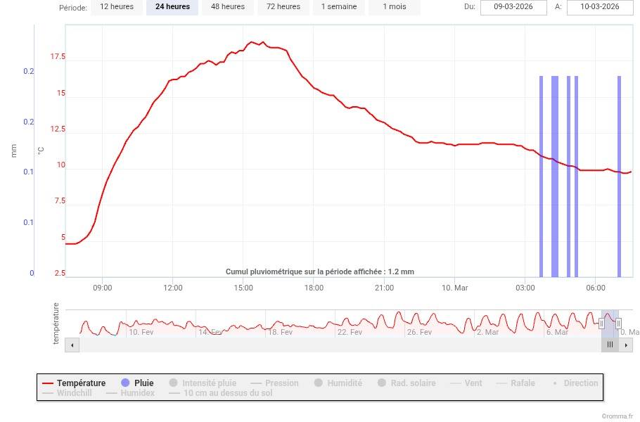 le 10 mars 2026 à 7h39 Si l’orage d’hier début de soirée nous effleuré donnant 3 gouttes il a bien arrosé St Etienne du Bois avec 9.4mm de pluie mais aussi de grêle en 20mn😲 Par contre ce matin les pluies faibles remontant de méditerranée nous apportent les premières précipitations du mois en attendant des éclaircies dans l’après-midi 🌤 Depuis hier soir 11mm à St Etienne du Bois vs 1.2mm ici à Viriat concentrés sur la fin de nuit et dans la douceur : 9.7° de minimale vs 1.3° de normale.Photos de la publication de Météo-Viriat