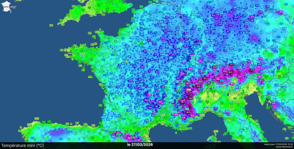 le 26 mars 2026 à 20h30 Fraîcheur et giboulées dans un ciel changeant rapidement d’aspect🤩 47km/h pour la plus forte rafale de bise sous l’averse de grésil de 16h20, 8.4° pour la maximale vs 15.1° de normale et 1.8° pour la minimale à 3h30 du matin sous une averse de grésil. Le Revermont était saupoudré au lever du jour notamment le Mont Myon. Malgré ce temps à giboulées, 3h30 d’ensoleillement ont été comptabilisées. Demain s’annonce sec ☁️🌥️⛅️🌤️☀️ avec une minimale autour de 0° C’est samedi au petit jour qu’une minimale entre -2 et -3° est toujours modélisée😫