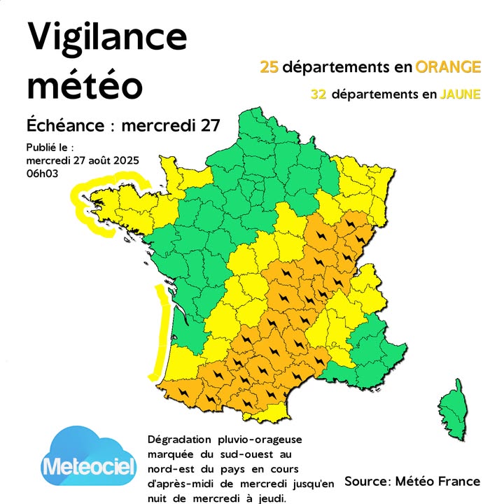 on 27 août 2025 at 6h23 25 départements sont placés en #VigilanceOrange 🟠 pour les #Orages ⚡ ce mercredi 27 août. Une dégradation pluvio-orageuse traversera du sud-ouest au nord-est entre cet après-midi et la nuit de mercredi à jeudi.