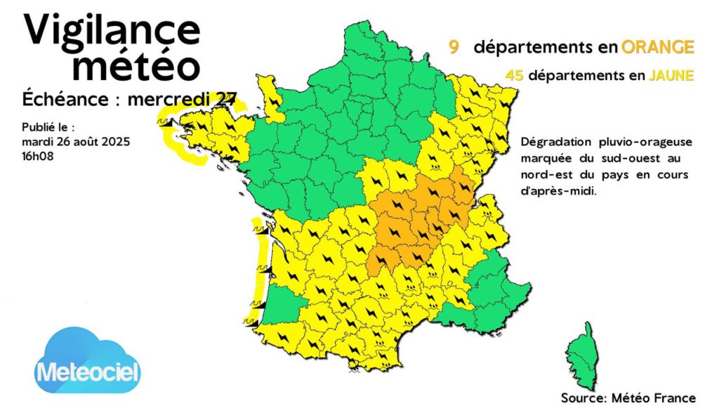 on 26 août 2025 at 16h21 9 départements du Centre-Est sont placés en #VigilanceOrange pour un risque d’#orages forts demain mercredi du Sud-Ouest au Nord-Est en cours d’après-midi. A noter également une #houle importante sur les littoraux de l’ouest lié à la tempête #Erin au large.