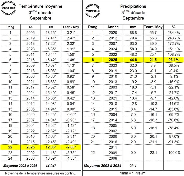 on 1 octobre 2025 at 6h18 Bilan de cette dernière décade de septembre : plus fraîche que la normale et abondamment arrosée. Pour des analyses plus détaillées : Températures décadaires 👉 Précipitations décadaires 👉