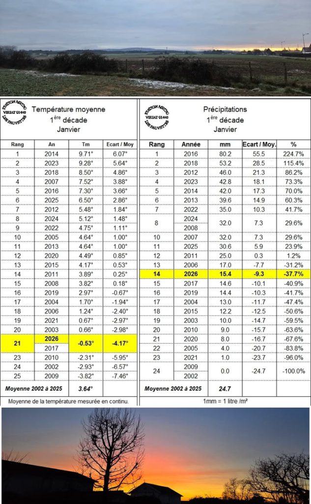 le 11 janvier 2026 à 21h51 Les quelques traces de neige encore visible ce matin suite les giboulées d’hier soir n’ont pas fait long feu. Après 5h20 d’ensoleillement, le gel fait son retour ce soir, -1.4°, mais ne résistera pas au vent du Sud qui va se lever en seconde partie de nuit rapportant une certaine douceur la semaine prochaine. O, sera loin d’une beau coup de froid qui a marqué la première décade peu arrosée par ailleurs. Pour plus de détail : Températures décadaires 👉 https://www.meteo-viriat.fr/articles.php?lng=fr&pg=78&mnuid=779&tconfig=0#z2 Précipitations décadaires 👉 https://www.meteo-viriat.fr/articles.php?lng=fr&pg=66&mnuid=779&tconfig=0#z2