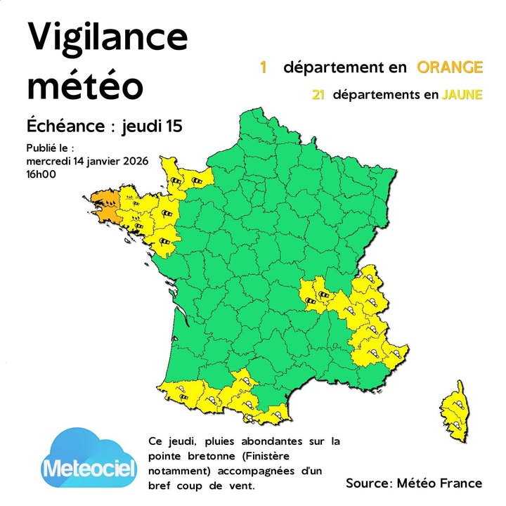 le 14 janvier 2026 à 21h40 Le Finistère est placé en #VigilanceOrange 🟠pour #pluie-inondation ce jeudi 15 janvier Un épisode pluvieux conséquent est attendu dans un contexte de sols déjà très humides, il est attendu en peu de temps plus de 40 mm avec des pointes localement à 60/70 mm.Photos de la publication de Meteociel