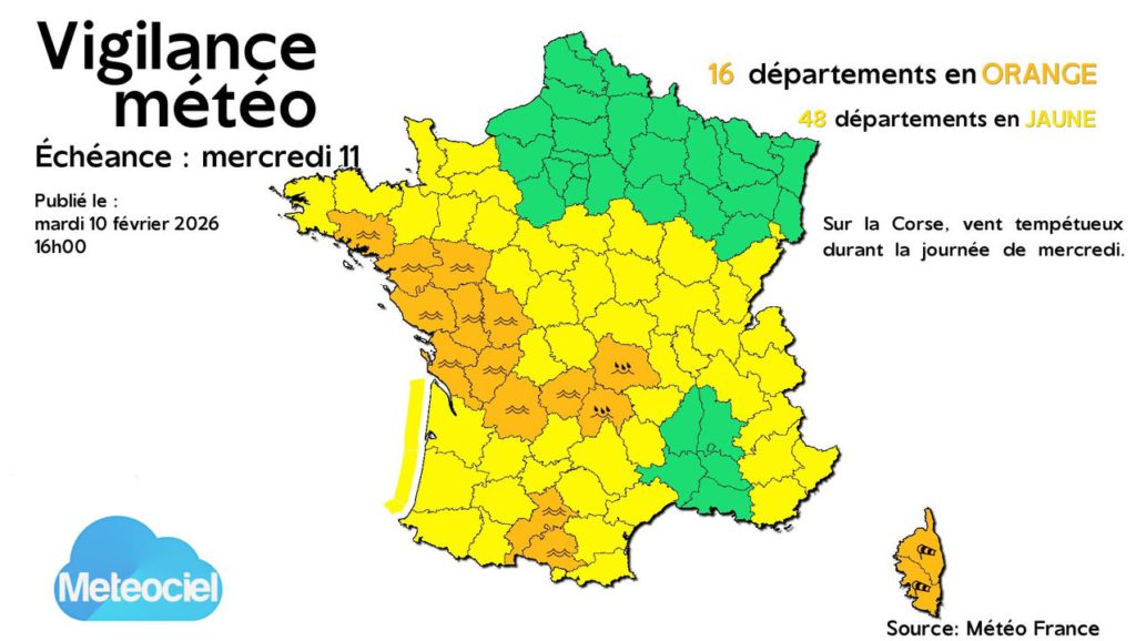 le 10 février 2026 à 20h41 16 départemements sont en #VigilanceOrange 🟠 8 tronçons de cours d’eau sur 12 départments sont en vigilance orange pour les #crues Demain mercredi 11, la #Corse sera placé en vigilance orange #vent a cause d’un vent d’ouest tempêtueux pouvant générer des rafales de vent de 140 à 160 km/h sur le Cap Corse. Des vents encore plus forts sont attendu pour jeudi. Le Puy-de-Dôme et le #Cantal seront placées eux en vigilance orange #pluie-inondation