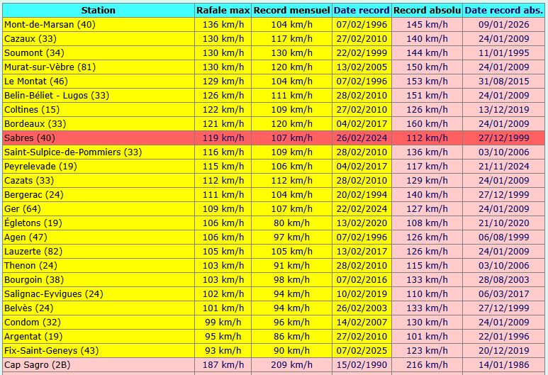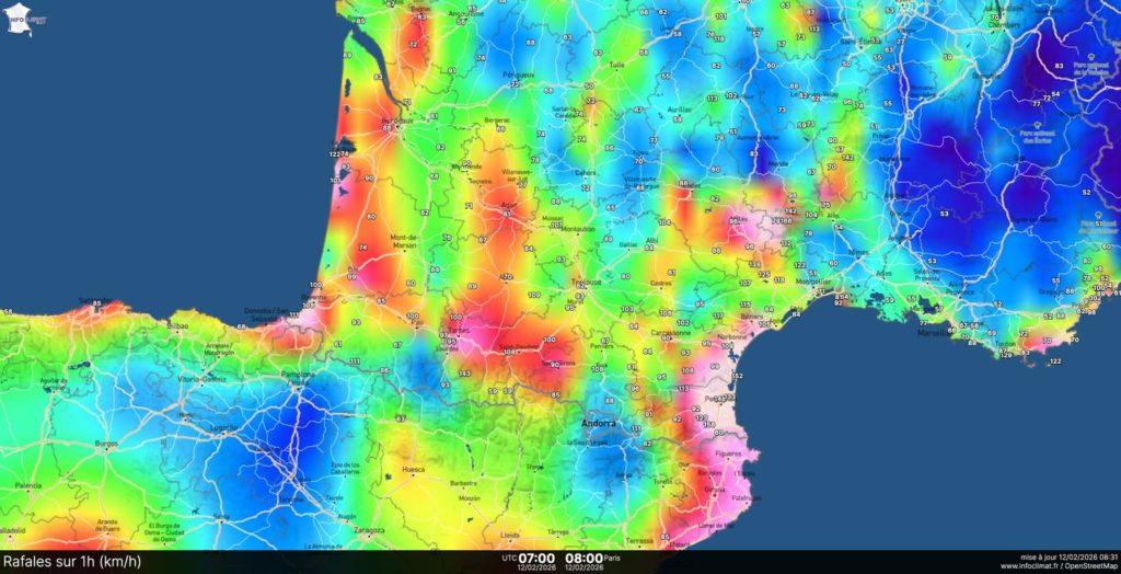 le 12 février 2026 à 8h26 🔴 #TEMPETE #NILS – SITUATION 12 février matin En ce début de matinée on releve les plus fortes rafales se près des Cévennes, ainsi que sur les plaines de l’Hérault, de l’Aude et du Roussillon. Quelques rafales remarquables observées cette nuit : 🌬️ 162 km/h à Biscarrosse (40) 🌬️ 166 km/h au Mont-Aigoual (30) 🌬️ 153 km/h à Leucate (11) 🌬️ 145 km/h à Port-la-Nouvelle (11) 🌬️ 142 km/h aux Plans (34) 🌬️ 124 km/h à Montdardier (30) 🌬️ 123 km/h à Perpignan-Rivesaltes (66) 🌬️ 120 km/h à Bédarieux (34) 🌬️ 119 km/h à Caunes-Minervois (11) 🌬️ 115 km/h à Carcassonne (11) 🌬️ 114 km/h à Narbonne (11) 🌬️ 113 km/h à Lodève/Soumont (34) 🌬️ 113 km/h à Durban-Corbières (11) 🌬️ 101 km/h à Aigues-Mortes (30) ⚠️ Liste non exhaustive. Des gros dégâts sont observés. Pensées pour les sinistrés 🚨 Soyez très vigilants. Il s’agit d’un évènement météorologique intense avec plusieurs départements en vigilance rouge 🔴 (Vent, crues, avalanches) #tempête #météo #vigilanceRouge #nilsPhotos de la publication de Infoclimat