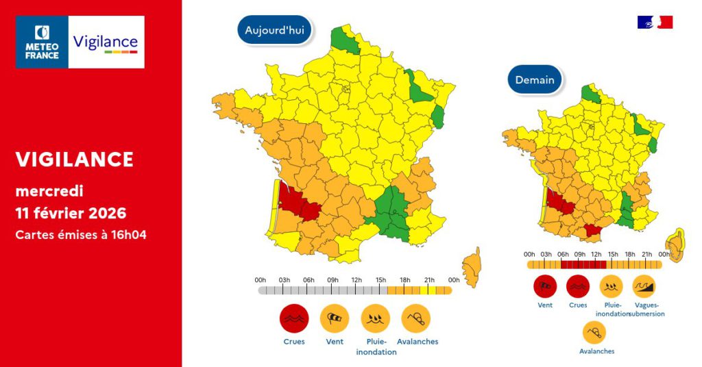 le 11 février 2026 à 19h44 🔴 Situation très préoccupante en France : 4 départements en vigilance rouge pour crues, vents violents et avalanches. Des habitations menacées dans les prochaines heures, y compris en Savoie où des avalanches peuvent descendre jusqu’en vallées. ⚠️ Vigilance ABSOLUE.