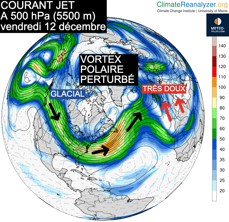 Cet afflux d’air froid intense génère un puissant courant d’altitude (courant jet) qui descend vers le Québec avant de remonter vers le nord de l’Europe, provoquant ainsi une remontée d’air doux sur nos territoires.