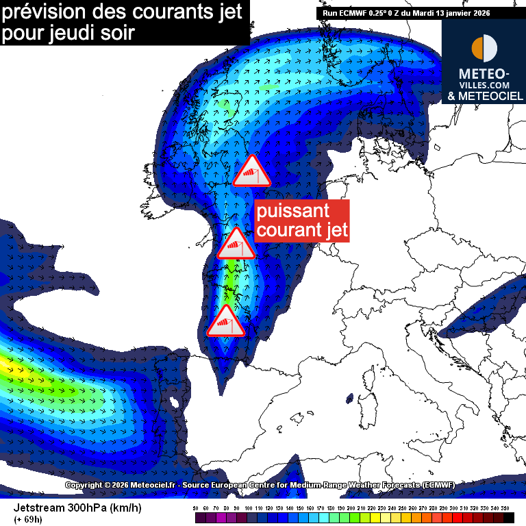 Prévision des courants jets pour jeudi soir sur l’Europe occidentale
