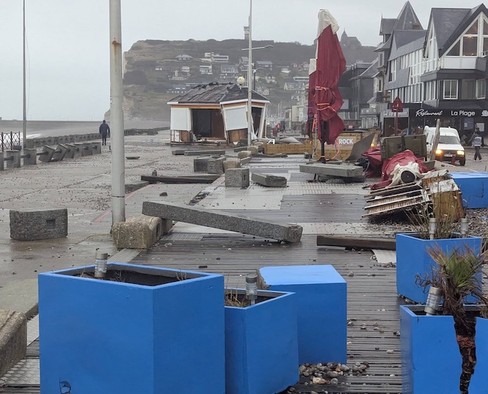 Les dégâts sur le front de mer de Fécamp après la grosse houle subversive de la tempête Goretti. La station du sémaphore a mesuré 157 km/h ! (© Le Phare à Images)