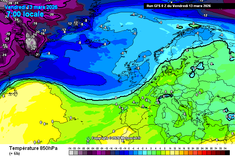 Animation des températures à 850 hPa sur l’Europe du 13 au 16 mars 2026 – Modèle GFS via meteociel