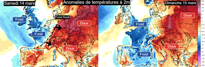 Anomalies de températures à 2m entre samedi 14 et dimanche 15 mars 2026 – Via TropicalTidBits