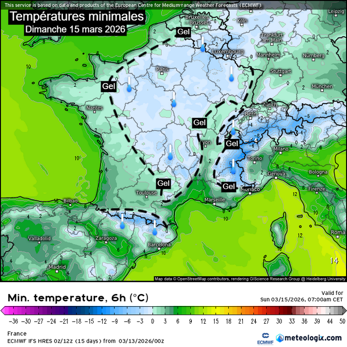 Températures minimales attendues dimanche 15 mars 2026 au matin – Modèle ECMWF HRES via meteologix