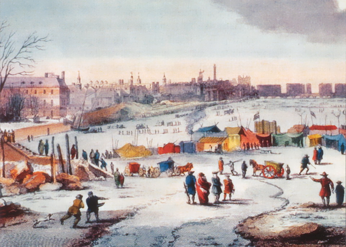 Parmi les hivers les plus froids du “petit âge glaciaire”, l’hiver 1683-1684 est souvent qualifié de “grand gel en Europe”. Certains historiens le décrivent comme l’hiver le plus sévère du millénaire. S’il n’y a pas de relevés de température, on sait qu’un froid glacial s’abat sur toute l’Europe du Nord, l’Angleterre, la Belgique, la France et la Suisse entre la fin décembre 1683 et février 1684. Les récits parlent de 56 jours de gel consécutifs à Paris ! À Londres, la Tamise gèle pendant deux mois et la glace atteint 28 centimètres d’épaisseur ! Le Lac Léman se fige aussi dans la glace pendant 18 jours !