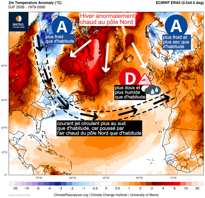 En fait, toutes ses anomalies sont liées entre elles. En effet, les températures exceptionnellement élevées au pôle Nord ces derniers mois ont engendré un vortex polaire très perturbé ainsi qu’une circulation très méridionale du courant jet.