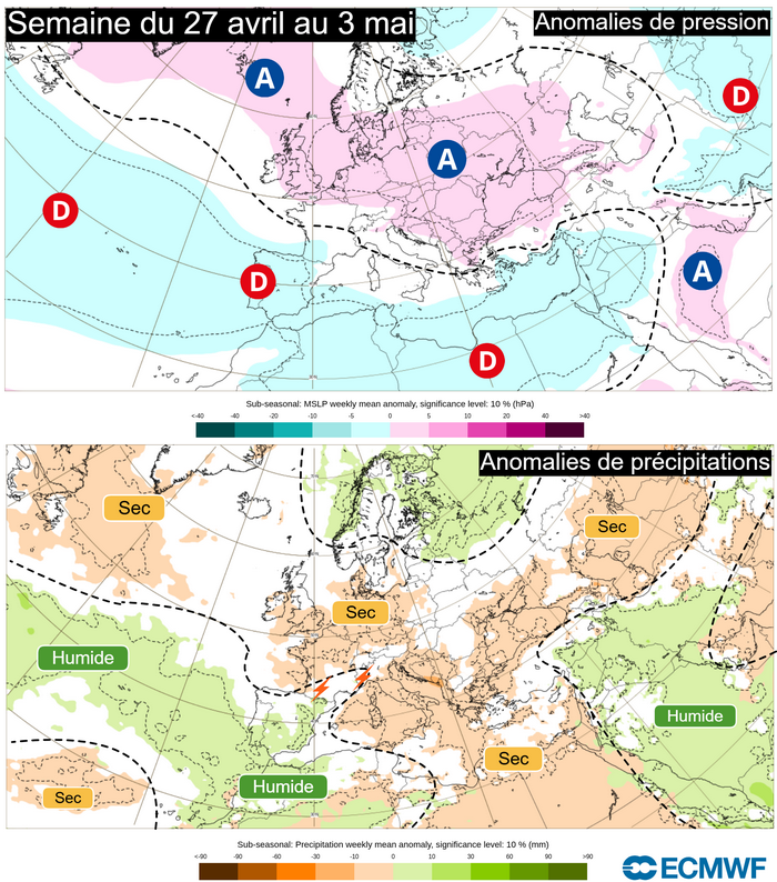 Anomalies de pression et de précipitations pour la semaine du 27 avril au 3 mai 2026 – ECMWF