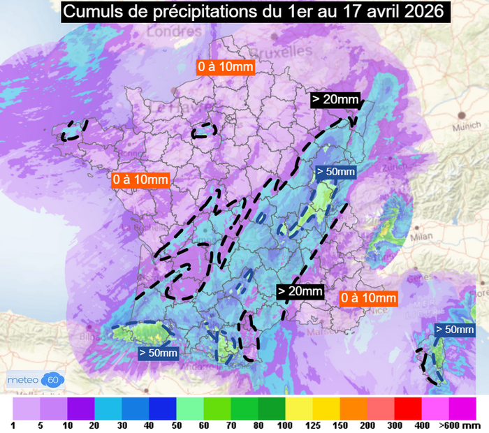Cumuls de précipitations depuis le 1er avril 2026 sur la France – Météo60