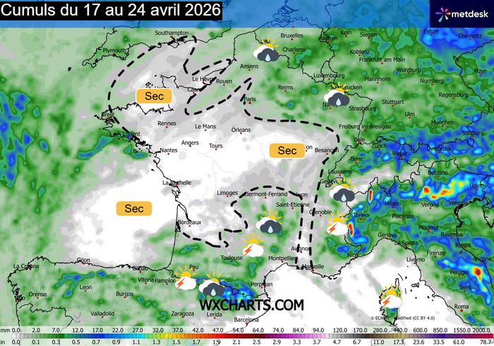 Ce mois d’avril est d’ailleurs globalement sec sur la France dans la continuité du mois précédent, qui avait présenté un déficit de précipitations de -23% à l’échelle du pays. De nombreux secteurs du nord et du sud est de la France n’ont en effet pas dépassé les 5/10mm en cette mi-avril.