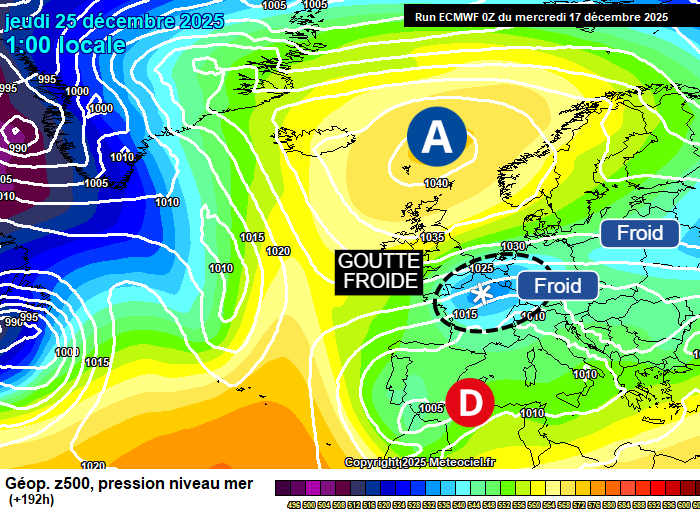 Goutte froide au dessus de la France le jeudi 25 décembre 2025 selon le modèle européen du 17/12/25 – via meteociel.fr