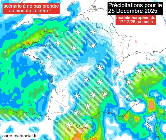 Précipitations pour le jeudi 25 décembre 2025 selon le modèle européen du 17/12/25 – via meteociel.fr