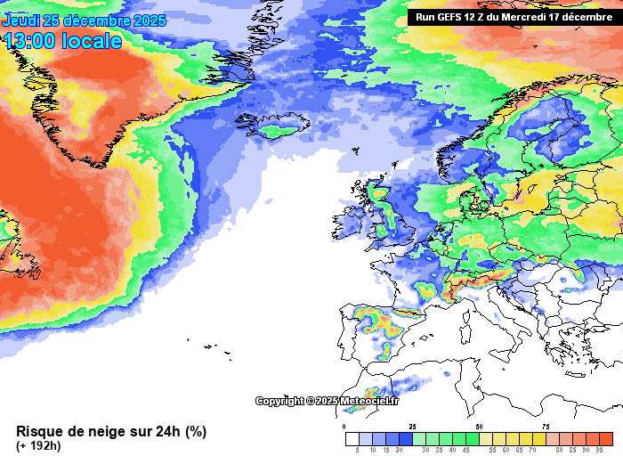 Probabilités de neige pour le jeudi 25 décembre 2025 en tenant compte des différents scénarios – meteociel.fr