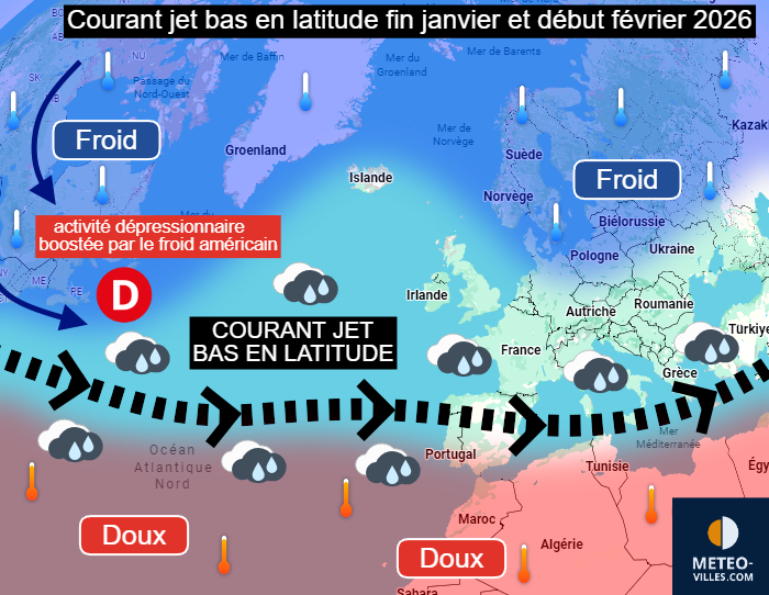Schéma montrant la circulation basse en latitude du courant jet fin janvier et début février 2026 – Météo Villes