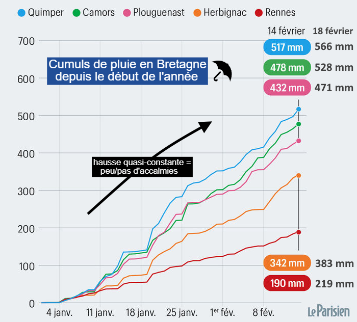 Sur les 45 premiers jours de l’année, 39 ont enregistré au moins 1 mm de pluie en moyenne nationale ! Cela signifie que 87% des jours ont été pluvieux en France depuis le début 2026, un chiffre remarquable ! Non seulement la pluie a été anormalement fréquente mais elle est aussi anormalement abondante. La Bretagne symbolise cet excès de pluie avec des cumuls tout bonnement remarquables. Au 18 février, il est déjà tombé 566 mm de pluie à Quimper depuis le début de l’année ! Cela représente 260% du cumul normal, c’est à dire qu’il est tombé 2,6 fois plus de pluie que lors d’un début d’année moyen ! Jamais de telles pluies n’avaient été observées depuis le début des mesures. Sur le graphique ci-dessous, on note l’absence d’accalmie avec des courbes qui croissent presque continuellement.