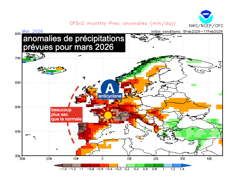 Anomalie des précipitations en Europe prévue pour mars 2026 – NCEP et meteo-villes.com