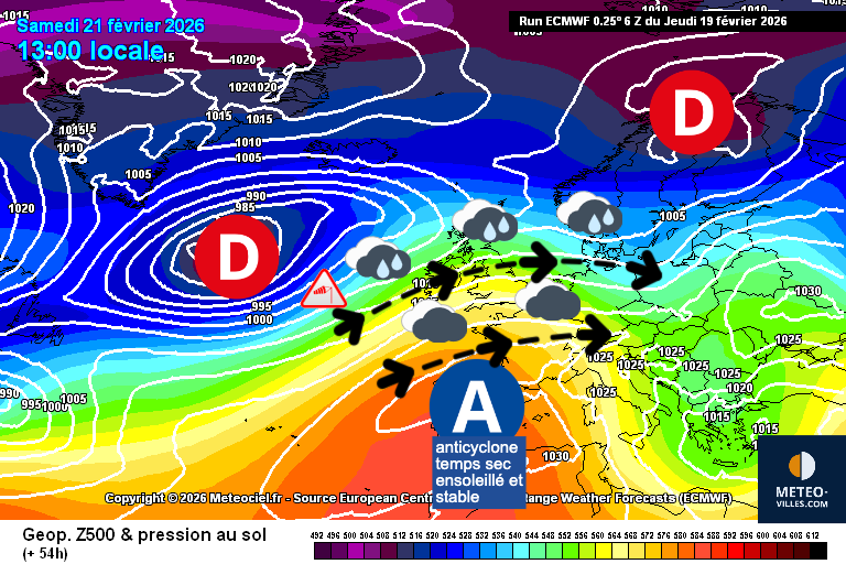 Le grand retour de l’anticyclone des Açores sur le sud-ouest de l’Europe ce week-end ! Carte de prévisions ECMWF pour samedi 21 février 2026