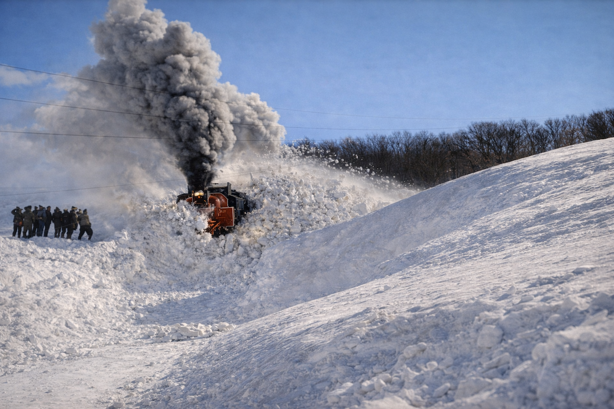 Cette photo, parmi tant d’autres prises en France, montre bien l’impact de la neige de la fin du mois de janvier 1914, notamment dans le Midi, bloquant les communications et retardant ou empêchant les trains. Cette image illustre les obstacles rencontrés. À Puichéric, près de Carcassonne, dans l’Aude, la neige a presque englouti la voie ferrée. Elle forme des murs abrupts ou des pentes douces. Deux locomotives à chasse-neige travaillent sans relâche pour dégager la neige. Leurs efforts font s’émietter le bloc de neige, mêlant fumée et poussière blanche emportée par le vent.