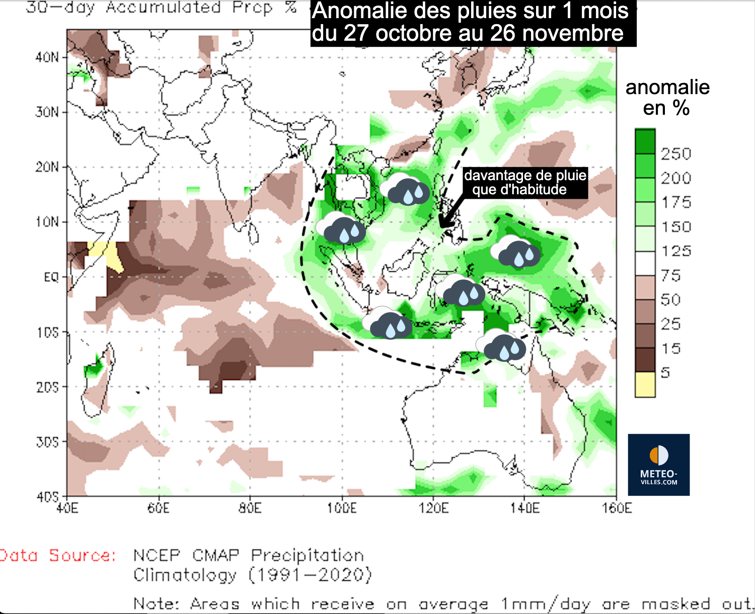 Anomalie des précipitations en Asie entre le 27 octobre et le 26 novembre 2025 – source : NOAA