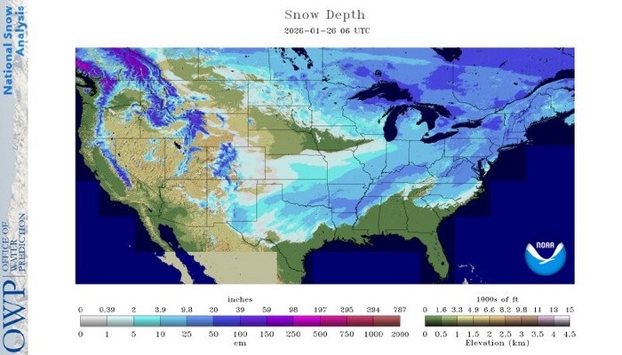 Couche de neige au sol sur les États-Unis le 26 janvier 2026 – NOAA