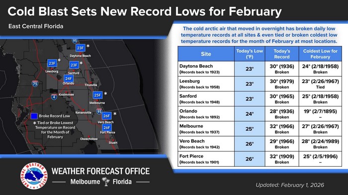 Records de basses températures observés sur le centre de la Floride le 1er février 2026 – NWS