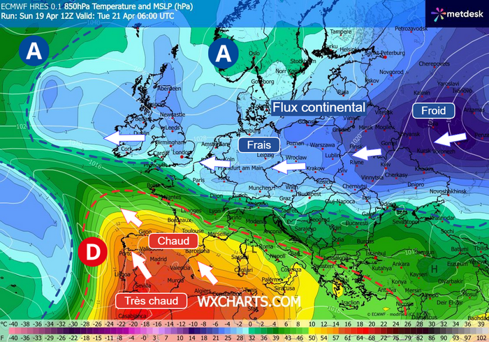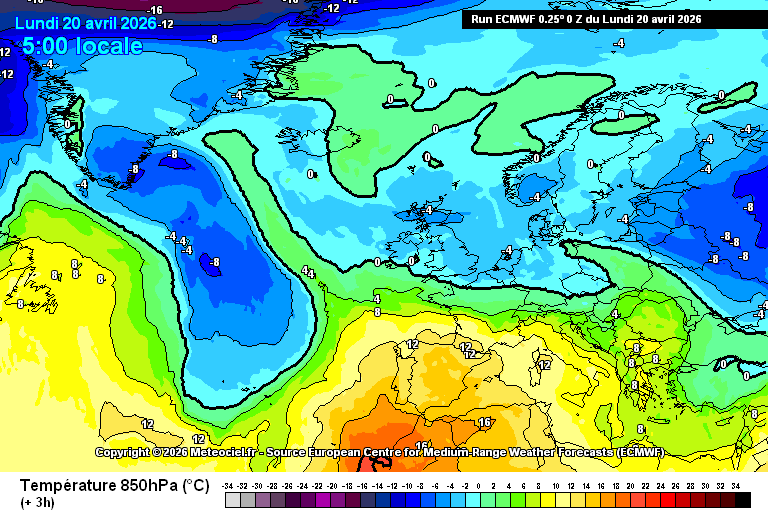 Animation des températures à 850 hPa sur l’Europe du 20 au 26 avril 2026 – Modèle ECMWF via meteociel