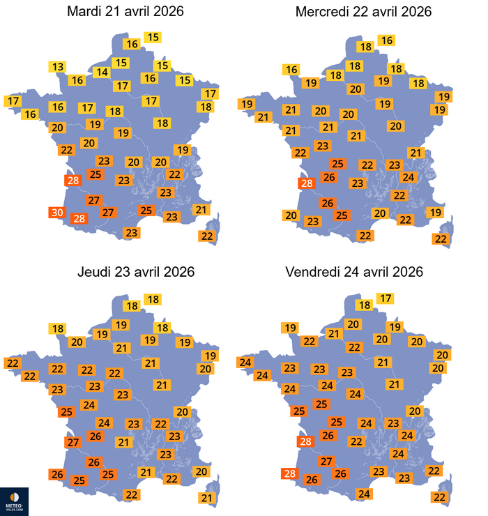 Températures maximales prévues sur la France du 21 au 24 avril 2026 – Météo-Villes