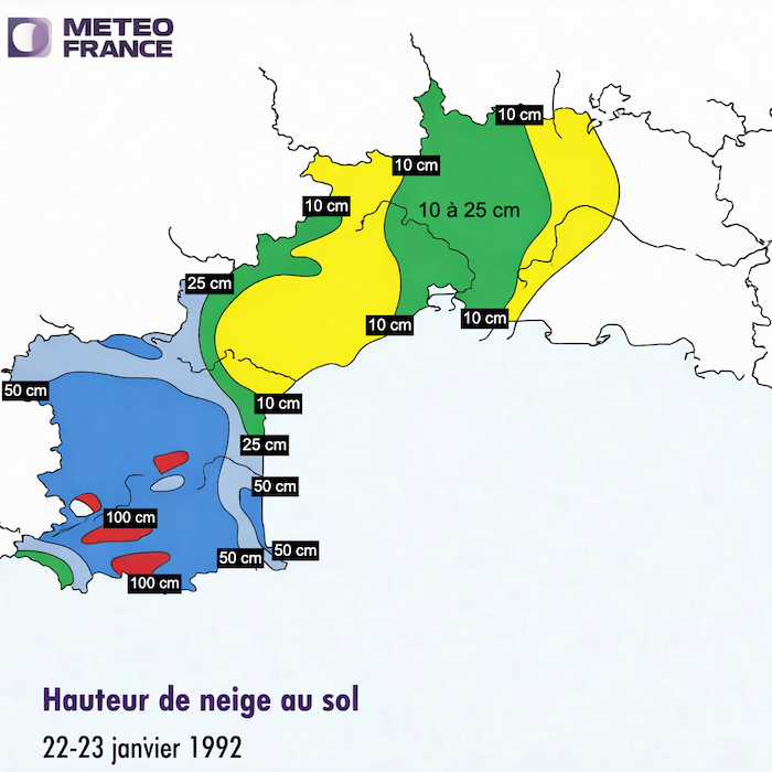 Entre le 22 et le 24 janvier 1992, le sud de la France connaît un épisode météorologique qui restera longtemps gravé dans les mémoires, en particulier dans le département de l’Aude et autour de Carcassonne. À cette période, une configuration atmosphérique inhabituelle s’installe : de l’air très froid descend du nord tandis qu’une perturbation humide venue de la Méditerranée remonte vers le Languedoc. La rencontre de ces deux masses d’air provoque des chutes de neige intenses et continues, phénomène rare dans une région au climat généralement doux en hiver.