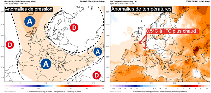Durant la décennie 2015-2025, les mois d’avril se sont en effet montrés anormalement anticycloniques sur l’ouest de l’Europe et la France par rapport à la période 1991-2014, chose que nous retrouvons à nouveau cette année. De même, les températures se sont montrées anormalement douces voire chaudes en moyenne durant cette même décennie.