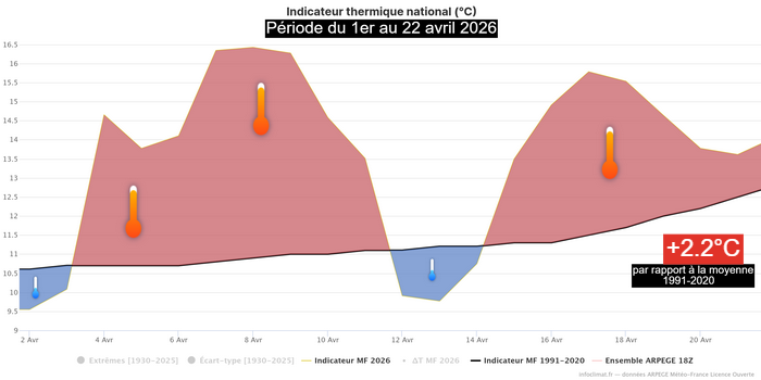 Évolution de l’indicateur thermique national sur la France du 1er au 22 avril 2026 – Via infoclimat.fr