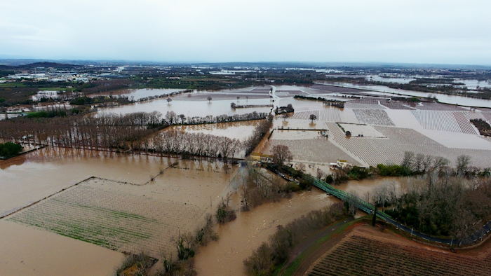 Crue majeure de l’Hérault vue depuis Bessan (34) ce lundi 22 décembre 2025 – mairie