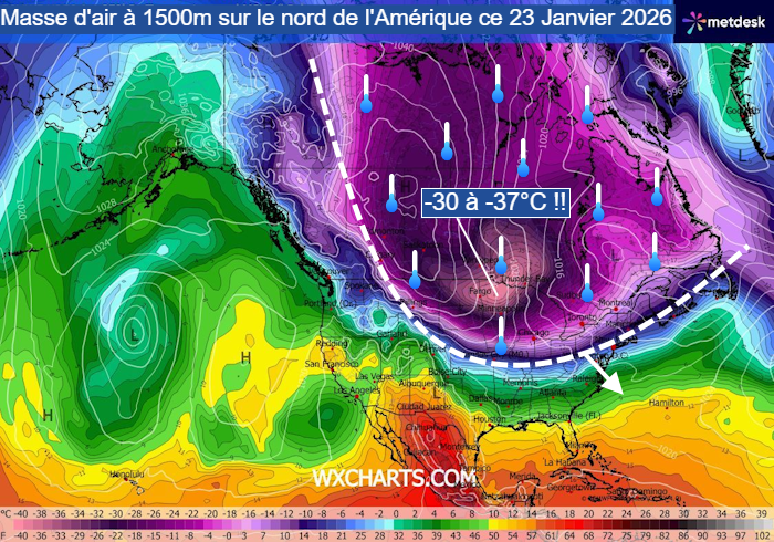 Le décrochage polaire qui intéresse le nord de l’Amérique est massif ! Une nouvelle vague de froid majeure débute de l’autre côté de l’Atlantique et cet air glacial est en train de gagner les États-Unis. Ce vendredi 23 janvier 2026, la température de la masse d’air à 850 hPa (vers 1500m) atteignait -37°C au dessus du Minnesota, des niveaux particulièrement bas et que l’on rencontre plutôt près du pôle ! Au sol, la barre des -30°C est d’ores et déjà franchie dans les États du nord des USA et les ressentis au vent sont encore plus glaciaux !