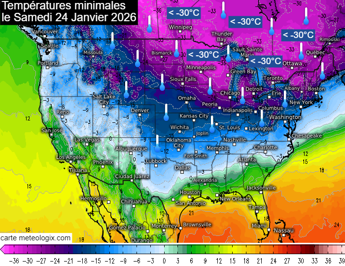 Températures minimales prévues aux USA le samedi 24 janvier 2026 – meteologix.com