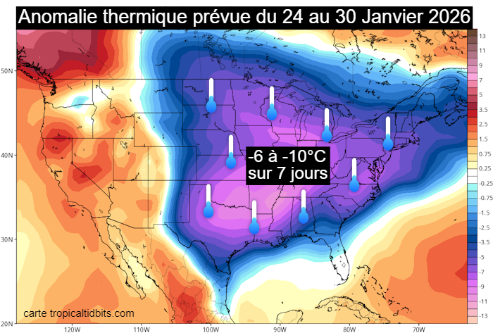Ce froid polaire va s’installer jusqu’à la fin du mois de janvier 2026 dans les États du nord, du centre et de l’est des USA, qui s’apprêtent donc à vivre une vague de froid marquée. Comme le montre la carte ci-dessous, l’écart à la normale calculé sur 7 jours – entre le 24 et le 30 janvier 2026 – atteindra -6 à -10°C sur plus de la moitié du territoire des États-Unis, jusqu’au nord du Texas ! Un tel déficit est considérable et montre que cette vague de froid ne sera pas anodine.