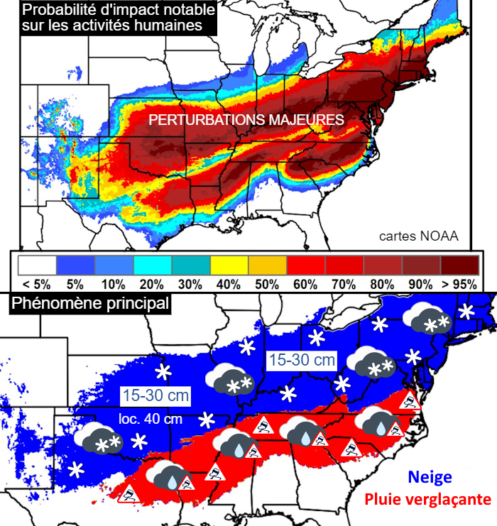Zones concernées par la neige et le verglas aux USA et probabilité d’impact sur les activités humaines – NOAA