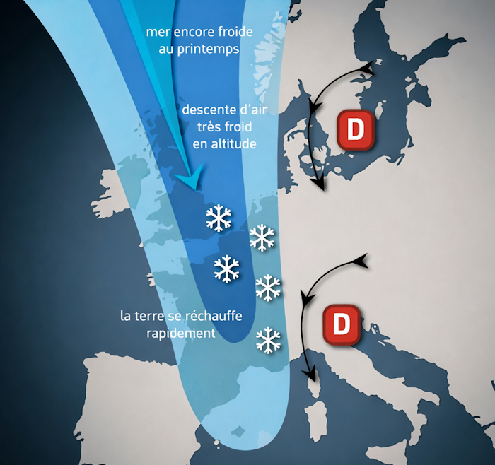 Schéma d’une coulée d’air froid propice aux giboulées lors du printemps – Météo Villes, livre Y’a plus de saison !