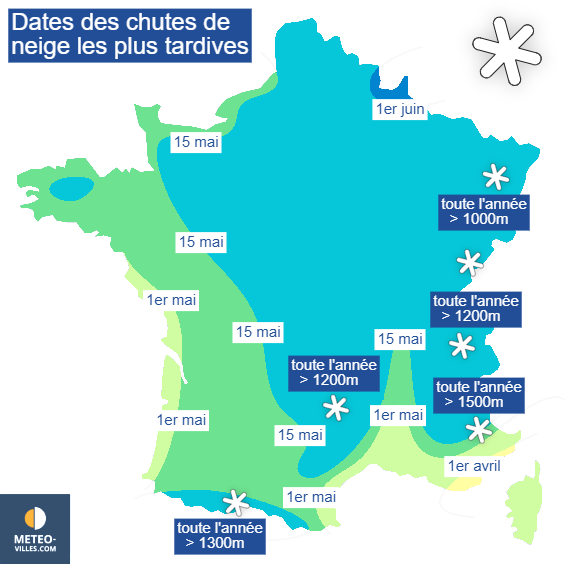 En règle générale, le risque de voir des flocons s’efface dès l’arrivée du mois d’avril sur la côte d’Azur. Il disparaît à la fin du mois d’avril sur les autres régions méditerranéennes ainsi que de la côte aquitaine à la côte vendéenne. Du sud-ouest aux côtes de la Manche, des flocons peuvent être observés jusqu’à la mi-mai. Sur tout le nord, le centre et l’est de la France, on peut encore voir des flocons tomber jusqu’en seconde quinzaine du mois de mai, généralement sous forme de giboulées au sein d’un ciel de traîne alimenté par une coulée d’air froid en altitude. En direction des Ardennes, le risque ne s’efface qu’à l’arrivée du mois de juin.