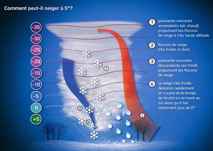 Schéma expliquant les giboulées et la possibilité de neige par température positive au sol – Météo Villes, livre Y’a plus de saison !