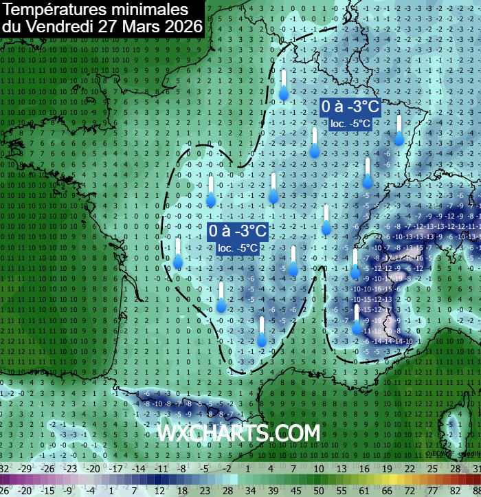 Températures minimales prévue le vendredi 27 mars 2026 – wxcharts.com