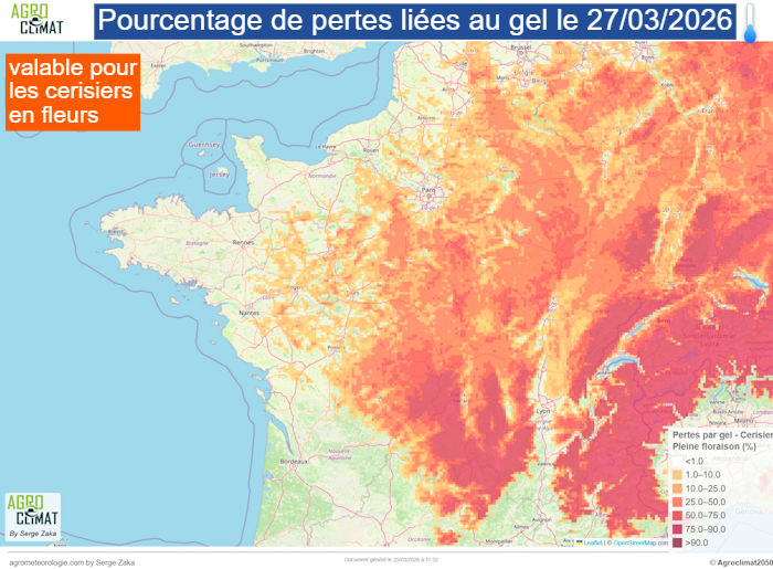 Estimation du pourcentage de pertes suite au gel du vendredi 27 mars 2026 pour les cerisiers en fleurs – Agro-Climat via Serge Zaka
